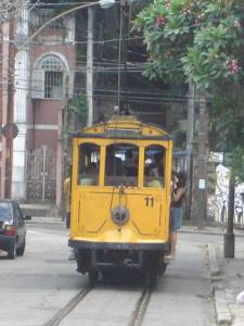 No dia seguinte, fomos ao aconchegante bairro de Santa Teresa. Caminhamos até o Centro do Rio e pegamos o bondinho até o bairro (na época estava funcionando). Subimos e seguimos dependurados, quanta adrenalina, o bonde andava a uma boa velocidade e quando cruzava com outro parecia que íamos esbarrar, além disso tínhamos que descer com ele andando!