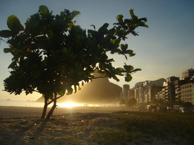 Seguimos para a praia do Leblon e aproveitamos o pôr do sol debaixo de uma árvore! Maravilhoso! E voltamos para casa, de ônibus.