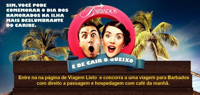 Que tal Curtir SETE dias no Caribe, em um RESORT cinco estrelas? Muitos viajantes já estão compartilhando essa SUPER promoção da Viagem Listo no Facebook, e se preparando para curtir a ilha de Barbados, no Caribe! Quer participar também? É simples, só Curtir a Fan page do Viagem Listo e participar no aplicativo http://viagemlis.to/aventuresbarbados e BOA VIAGEM!