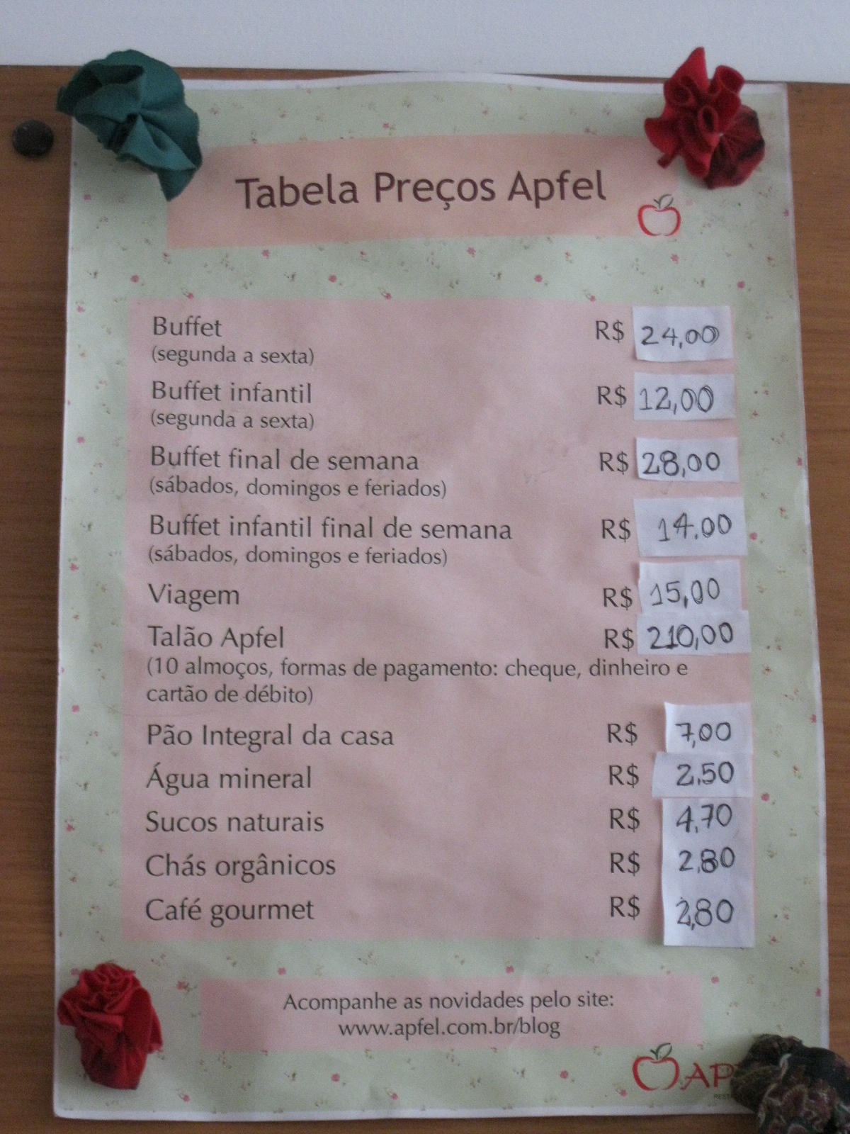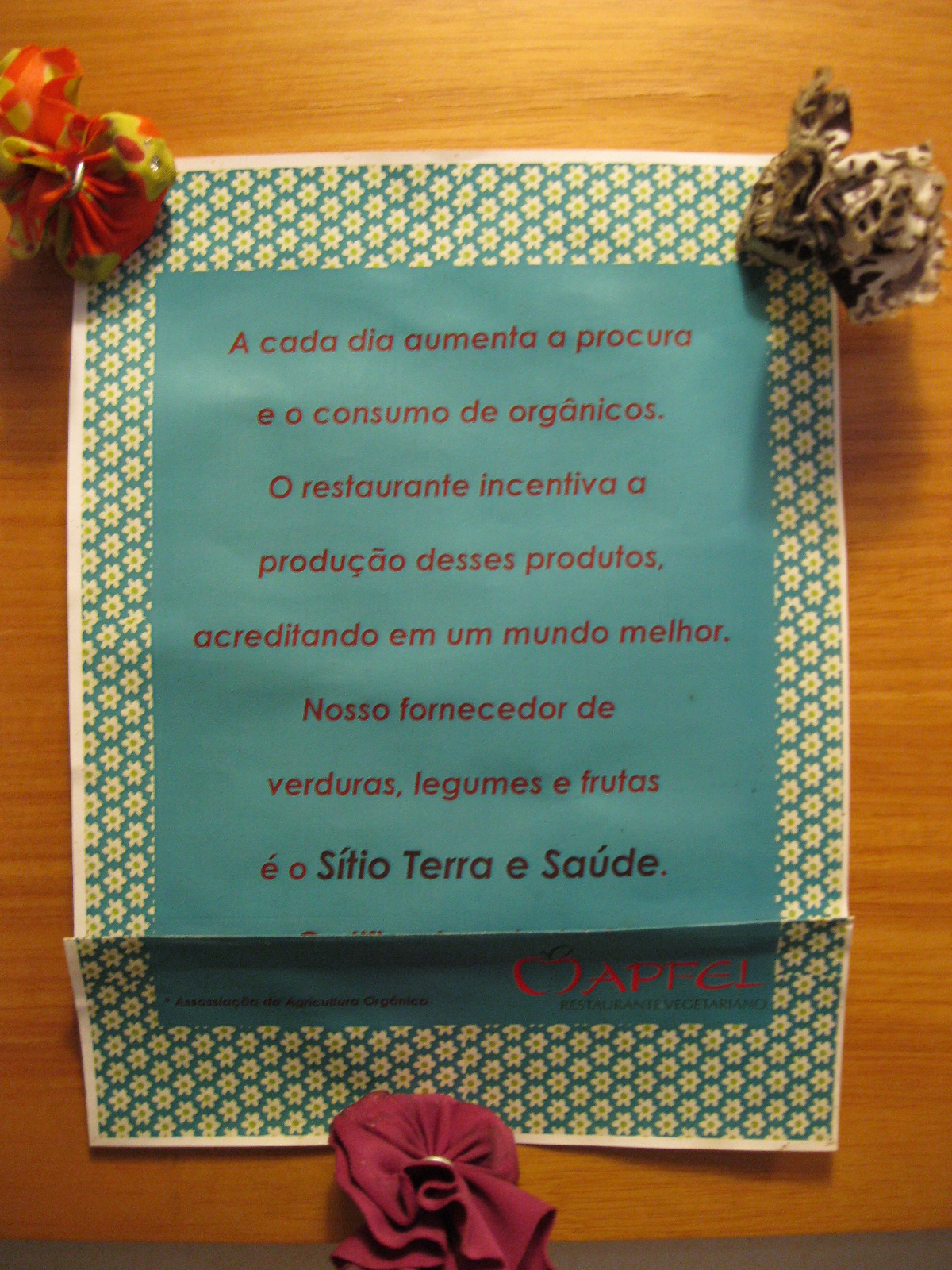 O Apfel é um restaurante tradicional, com seus 25 anos de existência. Sua filosofia é bem interessante, pois além de ser um restaurante vegetariano, ele trabalha com os produtos orgânicos sazonais, incentivando pequenos produtores. Então seu cardápio varia diariamente, de acordo com as verduras, legumes, frutas de cada época, promovendo um consumo consciente.