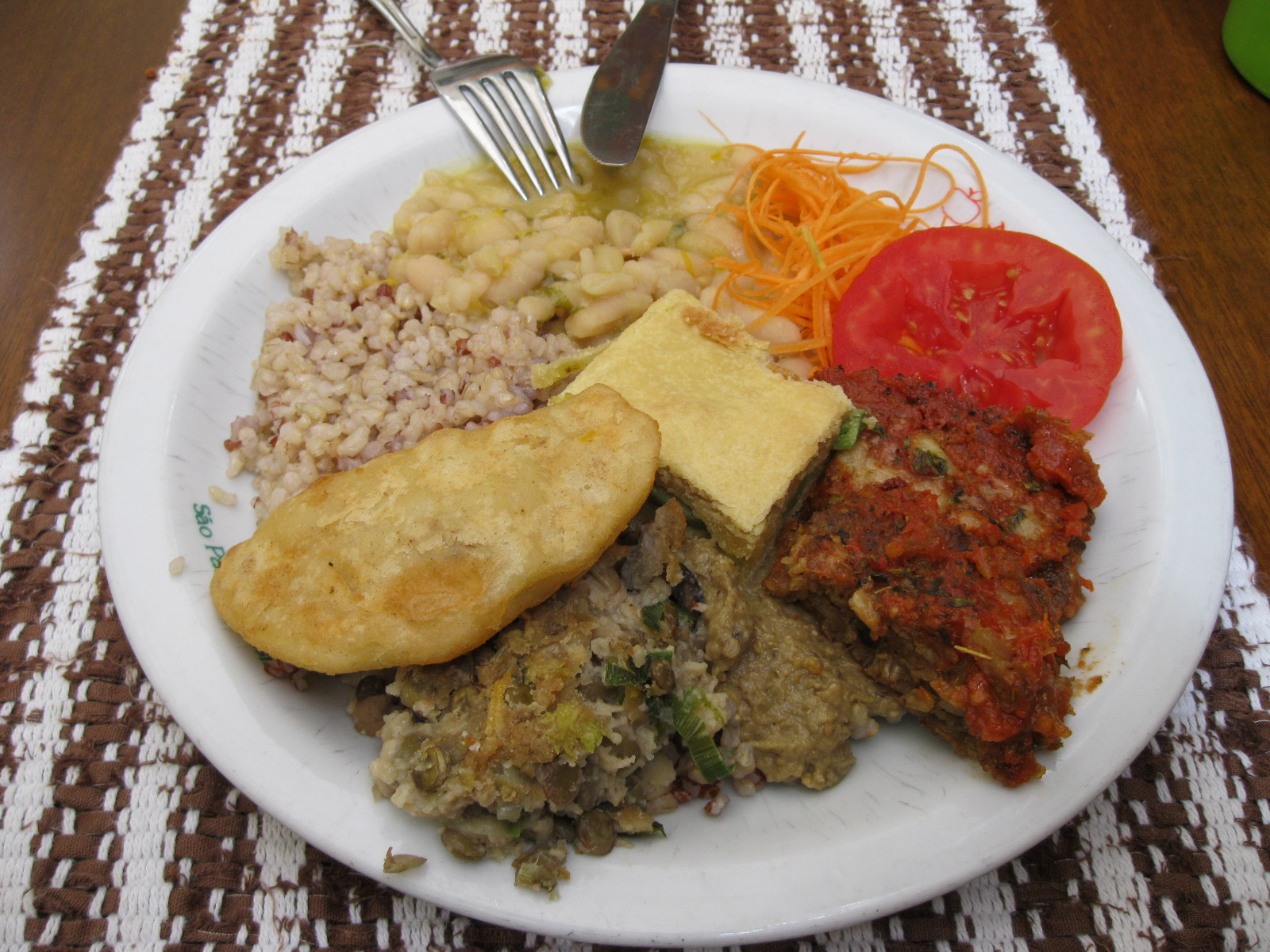 O Rodrigo comeu arroz integral, feijão branco com abóbora, tomate, cenoura, pastel de legumes, torta de lentilha, hamburguer de soja à parmegiana, torta de abobrinha e tomou suco de guaraná orgânico. Adorou, o difícil é o Rodrigo não gostar de alguma coisa, é bom de garfo!