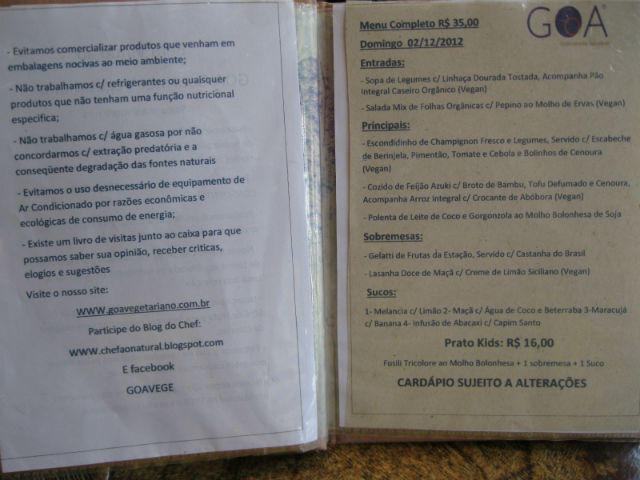 Em São Paulo, fomos no restaurante vegetariano Goa, que prezam pela gastronomia saudável, fazendo o bem para você e para o planeta, ou seja, um restaurante sustentável e com a filosofia bem interessante. O restaurante nasceu em 2004 como Gaia e por necessidade de propriedade industrial e intelectual, em 2009 alterou o nome para Goa Gourmet Vegetariano. Ela já recebeu alguns prêmios, saindo em diversas mídias. Tudo é muito bem pensado para causar o menor impacto ao ambiente, inclusive, você pode ir ao local de bicicleta, pois tem um bicicletário na entrada, achei o máximo!