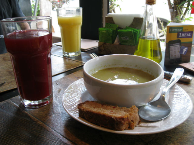 De entrada comi sopa de legumes com linhaça dourada tostada, acompanhada de pão integral caseiro orgânico (vegan), bem leve e saboroso. O Rodrigo foi direto para o prato principal, de suco ele optou pelo maracujá com banana, bem diferente e eu maça com água de coco e beterraba.