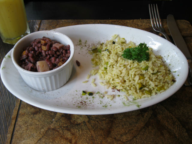 O rodrigo comeu cozido de feijão azuki com broto de bambu, tofu defumado e cenoura, acompanhado de arroz integral com crocante de abóbora, sendo que esta era uma das opções vegan do dia.