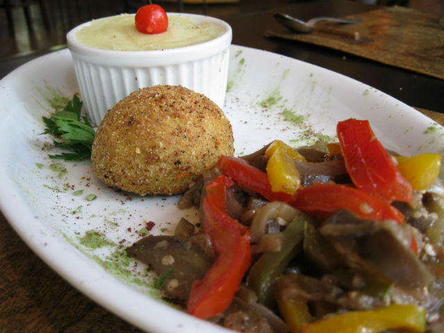 A outra opção de prato era o escondidinho de champignon fresco e legumes, servido com escabeche de berinjela, pimentão, tomate e cebola e bolinho de cenoura, também era um refeição vegan. O prato enche os olhos, mas ficou para próxima, estávamos bem satisfeitos.