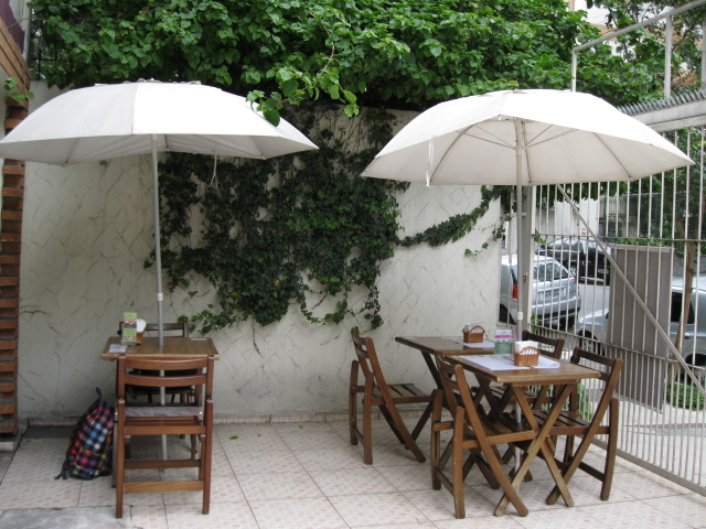 Apesar da chuvinha em São Paulo, nos acomodamos na área externa, que tem mesinhas com guarda-sol.