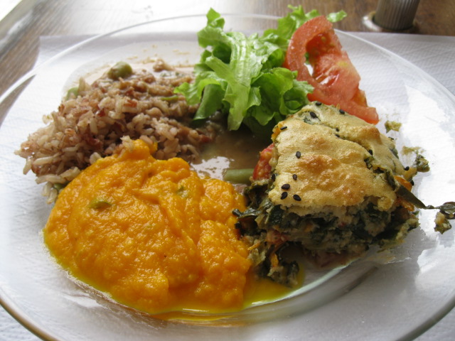O Rodrigo comeu de tudo: torta de escarola com tomate seco, creme de cenoura com castanhas, arroz integral com vagem, caldo de feijão com ervas finas e salada variada e eu me servi, primeiramente, do caldo de feijão e, depois, do mesmo que o Rodrigo.