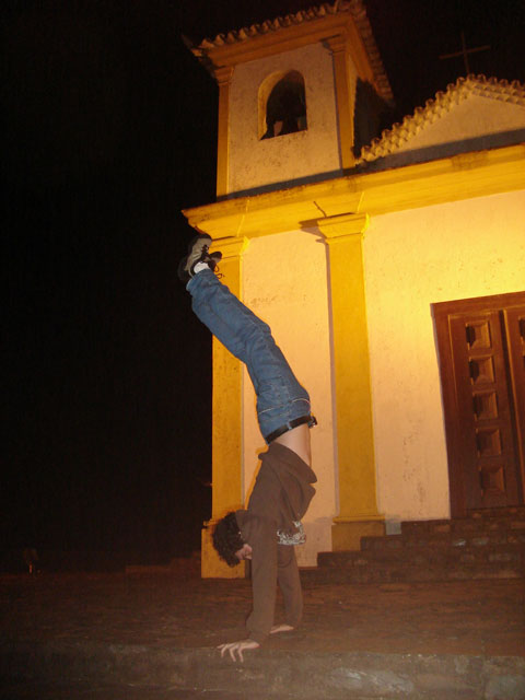 Uma foto exibindo meu lado criança de plantar bananeira, assim como a do banner do aventure-se. Gosto muito desse dia: a foto é na igreja da Serra da Piedade na cidade de Caeté/MG, quando recebemos aqui em Belo Horizonte nossa primeira Couchsurfer.