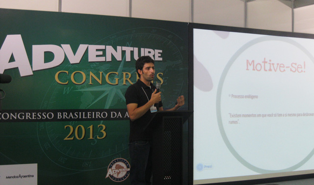 Fiz um discurso instigando os ouvintes a se aventurarem de forma consciente e desfrutar não só do turismo tradicional, apresentando formas de turismo alternativo. Além de despertar o espírito aventureiro para fazer o que gosta, como é o meu caso ou, no mínimo, conciliar esse lazer no cotidiano. Na apresentação, a única imagem que utilizei foi o banner com o slogan do aventure-se.com (escrita no português informal) “faz as malas! fugimos hoje”, fora isso não apresentei nenhuma imagem, estatísticas ou pesquisa. Utilizei pensamentos e frases filosóficas com intenção de refletir e instigar a aventura, além de citar alguns projetos do aventure-se.com.