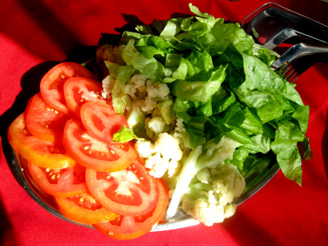 Quando a comida chegou, que abundância! Não parava de chegar pratos…rs Começou pela salada de alface, tomate e couve-flor, depois os pratos quentes: arroz, feijão, abóbora, batata frita, farofa, tudo tamanho família, e o omelete gigante, uma para cada um! A mesa estava tão bonita e colorida que começamos a comer pelos olhos! Além disso, tem azeite e molhinhos de colocar na salada e onde mais desejar.