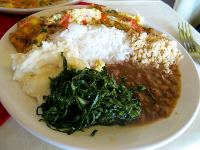 O cardápio no segundo dia não ficou pra trás: a salada de alface, com tomatinho e palmito, arroz, feijão, taioba, purê de batata, farofa e o omelete, tudo no capricho e muito saboroso! Fica a dica para quando for em Carrancas!