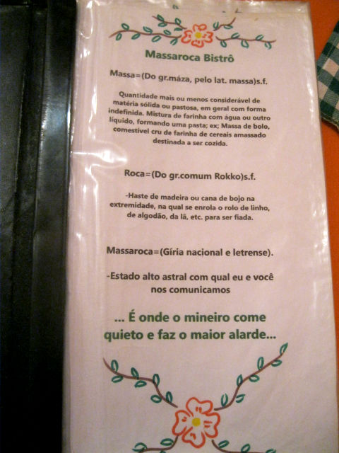 Uma curiosidade que tínhamos era sobre o significado do nome: Massaroca, mas antes de perguntarmos para Sara, encontramos a explicação na primeira página do cardápio.