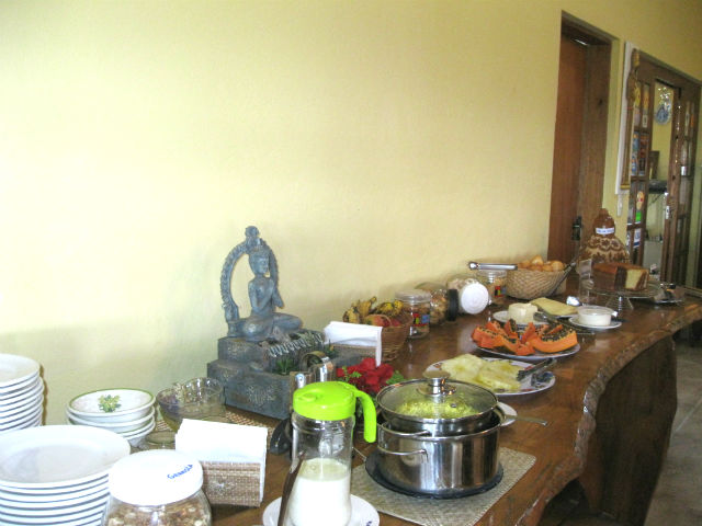 O café da manhã oferece uma mesa caprichada com diversas comidinhas mineira! Pão de sal, pão integral, pão de queijo quentinho, bolo (cada dia um sabor diferente), frutas da época, sucos naturais, café, leite, chás diversos, queijo regional, frios, ovos mexidos, variados biscoitos caseiros, geleia de fruta, requeijão caseiro, manteiga, mel, etc… é muita coisa, difícil lembrar de tudo! É uma refeição para comer como um rei, encher o corpo de energia e se preparar para realizar os diversos passeios pelas cachoeiras.