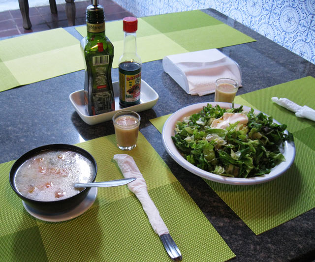 Minutos depois de termos feito nossos pedidos, eis que nos chegam nossas entradas, a minha: salada verde orgânica com maionese de soja. E da Raquel canja de legumes. Ambas acompanhadas de caipirinha sem álcool feita de gengibre, rosas brancas e limão.