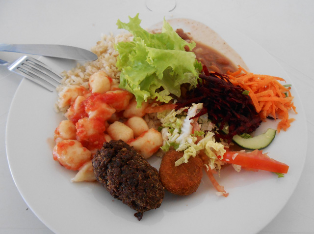 Ao me servir, minha escolha foi fazer um prato bem colorido, conforme sempre faço e é o indicado por vários nutricionistas. Coloquei arroz, feijão, salada, beterraba, cenoura, tomate, pepino, quibe de soja, nugget de soja e nhoque ao molho sugo (que delícia!). A Raquel se serviu basicamente das mesmas coisas, exceto arroz e feijão. A comida é extremamente saborosa, o nhoque é bem macio, com molho natural; o nugget e quibe são deliciosos, com gostinho de quero mais. Para beber, tomei suco de tangerina e a Raquel suco de tamarindo, tudo natural!