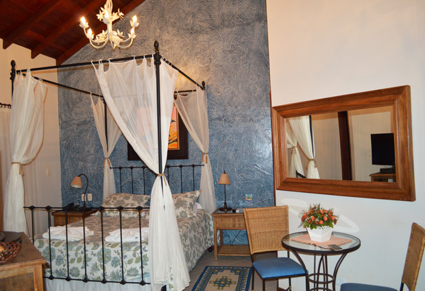 O apartamento em que ficamos, categoria Luxo Especial, era espaçoso, com uma grande cama (Queen Size com dossel), TV a cabo, frigobar completo, uma pequena mesa com duas cadeiras, armário com cofre eletrônico, ar condicionado/aquecedor e sofá, além de uma pequena varanda com vista para área central dos jardins. Enfim, um quarto muito confortável e com uma decoração linda! Assim como outros ambientes do hotel, no quarto há um quadro do artista Isaac de Oliveira que retrata a fauna e a flora da região. O banheiro também era amplo, contava com roupões de banho, amenities e secador. Ah, tem uma ducha maravilhosa!