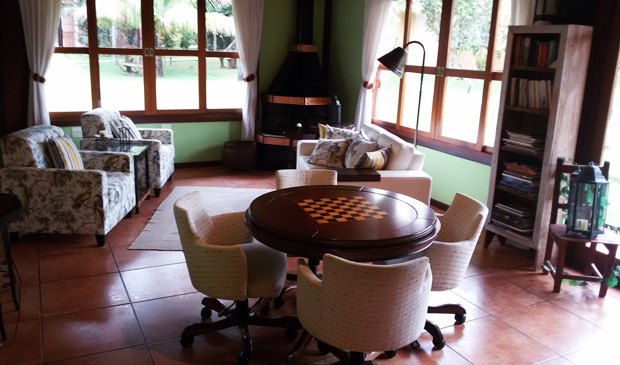 Um outro espaço bem aconchegante ao lado do restaurante é uma sala de estar com TV, estante de livros, sofás e uma lareira para as noites frias. Delícia também ficar sentado neste espaço contemplando os jardins do hotel, assim como no redário.