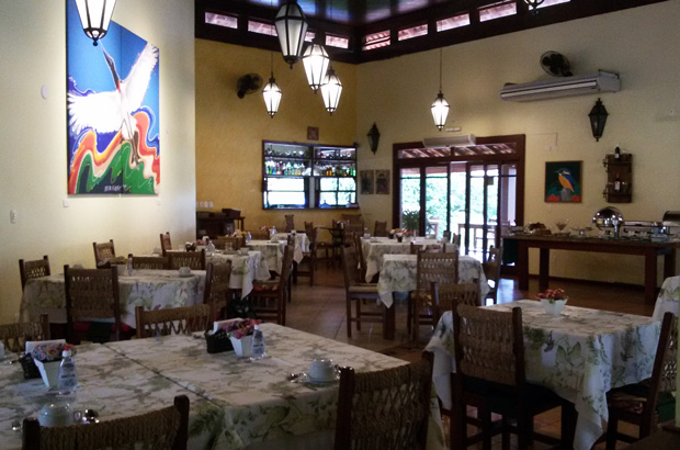 O café da manhã é bem diversificado e caprichado, com pães brancos e integrais, tortas, pudins, bolos, cereais, iogurtes, geleias, queijos, sucos, frutas, frios etc., impossível experimentar de tudo. Não deixe de manter-se em silêncio por uns segundos para ouvir os pássaros, nem sempre é possível ter essa harmonia com a natureza.