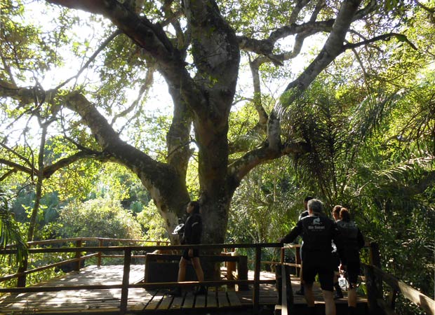 Uma vez tudo certo com os equipamentos, é hora de seguirmos de caminhonete até o início de uma trilha ecológica, onde é possível observar alguns animais (Raquel conseguiu ver um pequeno jacaré na trilha, sério!) e várias árvores. Nesta trilha inclui uma visita à nascente do Rio Sucuri.