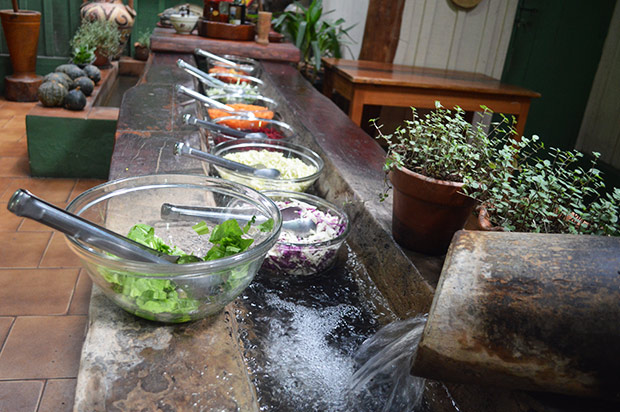 Falando em cozinha, uma das atrações da Estância Mimosa é a sua gastronomia. Assim que os visitantes chegam são recepcionados com bolos, biscoitos, café e chá servidos nas tradicionais canecas de metal pintado. O almoço é preparado e servido diretamente no fogão de lenha e o buffet de saladas em uma instigante mesa onde tem uma bica de água corrente, que mantém as saladas resfriadas.
