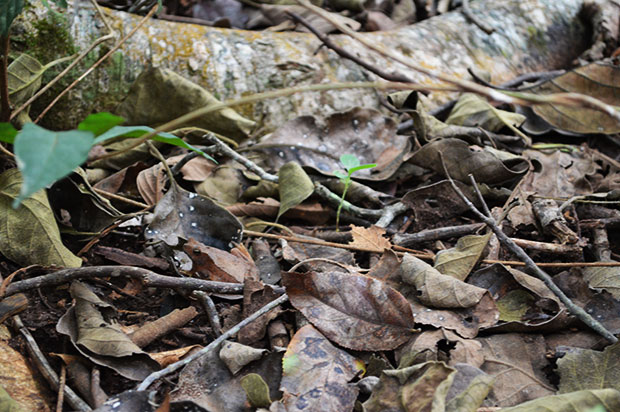 A trilha tem muito cascalho e degraus, além de pontes e plataformas de observação. Interessante é que quase todo o trajeto é feito na sombra das árvores. Durante o percurso, além das cachoeiras, fique atento às explicações do guia sobre a fauna e a flora da região. Uma dessas explicações foi sobre um sapo camuflado que encontramos no caminho. Ah, sempre encontramos algum animal silvestre pela trilha como macaquinhos, araras, entre outros. Mas, voltando ao sapo, tente localizá-lo na foto abaixo. hehehe