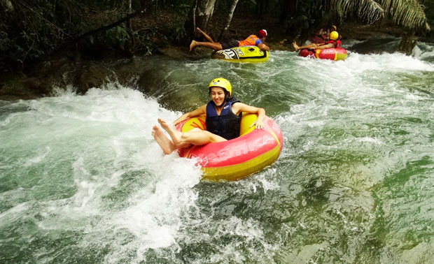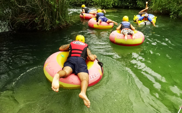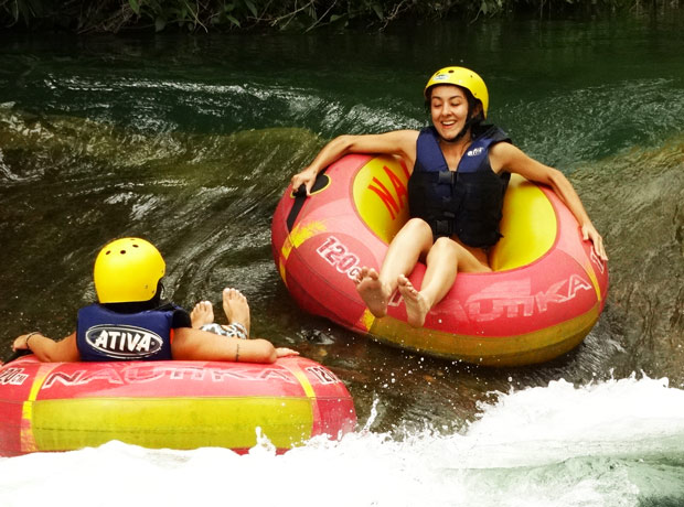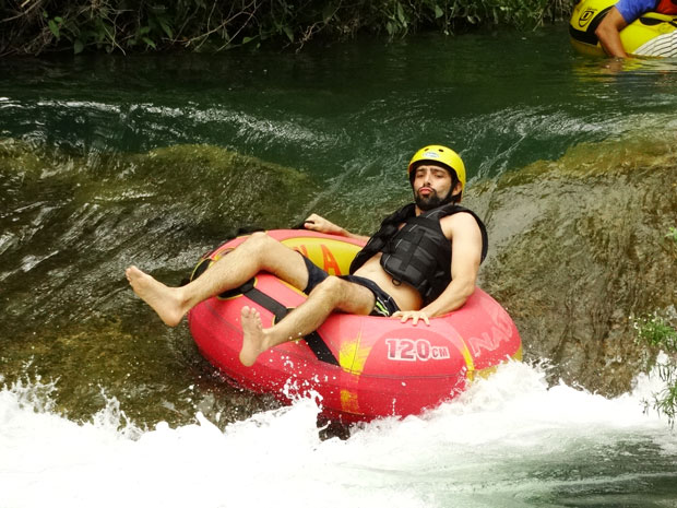 O passeio dura cerca de 40 minutos e os guias vão dando apoio o tempo todo para as boias seguirem o percurso correto, o que nos trás muita segurança. Afinal é preciso, pois, por exemplo, logo na primeira queda d’água todos do meu grupo caíram da boia. É adrenalina total, haja sorrisos, gargalhadas e caras estranhas.. hehe
