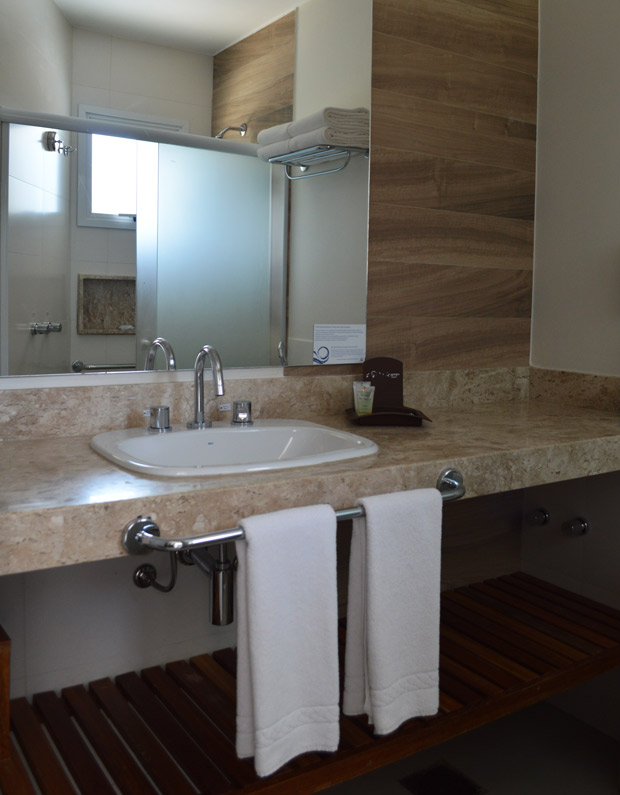 O quarto onde ficamos hospedados possuía uma cama de casal e uma de solteiro, ambas muito confortáveis. Um apartamento moderno e com decoração clean, contava com TV, minibar, cofre, mesinha, ar-condicionado e internet com acesso Wi-Fi. Aliás, em todo o hotel não tivemos problema com internet, funcionava super bem.