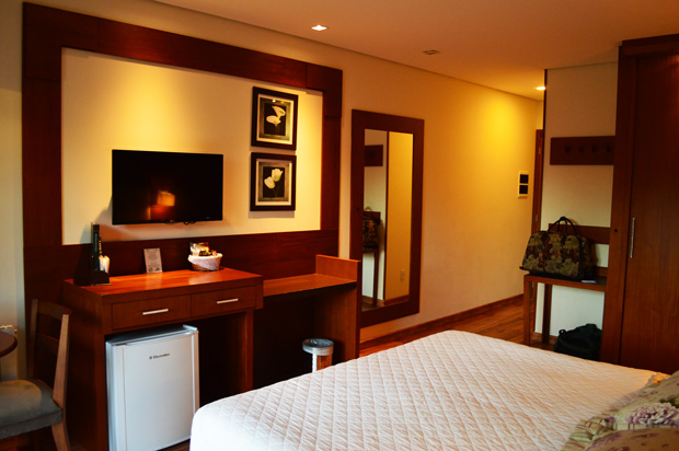 O quarto em que nos hospedamos é amplo, acolhedor e bem equipado com ar-condicionado, aquecedor, TV, Wi-fi, geladeira, guarda-roupa com cofre, uma poltrona, mesa com cadeiras e sacada com vista para área externa do hotel. Além, é claro, de uma cama king incrivelmente confortável e um banheiro espaçoso com diversos amenities bem cheirosos.