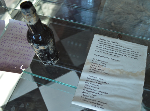 No acervo também há uma curiosa carta, encontrada dentro de uma garrafa durante a restauração da igreja e escrita por um dos operários que trabalhou na construção da igreja em 1877. Por motivos de conservação, a carta original está sob a guarda do Departamento de Patrimônio Histórico da SEC, porém na exposição tem uma cópia fotográfica e ao lado, o conteúdo da carta. Ficou curioso para ler o que está escrito? Clique na imagem abaixo e descubra ; )