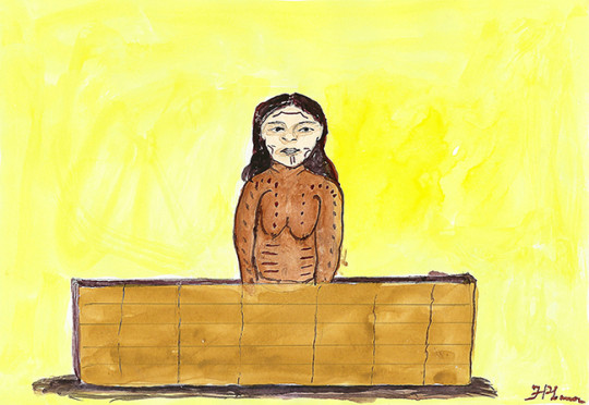 Só os dois homens moravam naquela casa. Mas Wasu viu que tinha materiais de trabalho de mulher. Tinha ralo, tipiti, cumatá, peneira, aturás, balaios, forno para fazer beiju. Tudo! Um dia, Diabo sem Cu foi convidado pelo pessoal de outra aldeia para ir tomar caxiri com eles. E foi-se embora! Ficou somente o primo dele, Wasu, para tomar conta da sua casa. À tardinha, começou a ouvir um barulho no alto do jirau da casa, viu que algo se mexia. Wasu ficou olhando o que estava acontecendo. De repente, viu que tinha um baú no alto do jirau. Ele abriu o baú, de onde surgiu uma mulher bonita. Ela saiu da mala, desceu e foi mexer em todo o material da casa. Fez beiju, farinha… Quando acabou tudo, ela entrou no baú. Wasu, vendo que ela era bonita, começou a namorar a mulher do Diabo sem Cu.