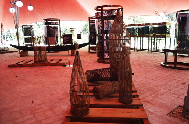 Durante a visita guiada, fizemos paradas em duas tendas onde estavam a exposição “Peixe e Gente”, que mostra as práticas e as armadilhas de pesca do povo que vive na região do Alto Rio Negro.